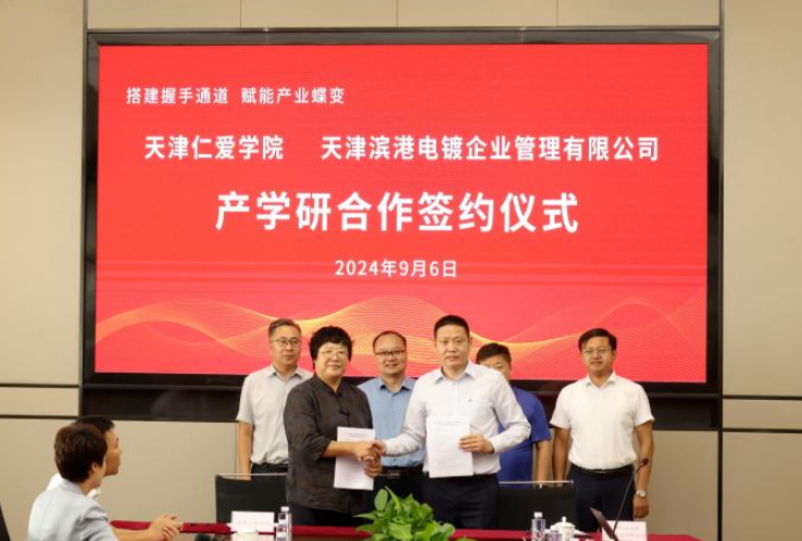 會上,天津仁愛學院分別與天津濱港電鍍企業(yè)管理有限公司、天津市歐澤金屬表面處理有限公司、天津德威金屬表面處理有限公司簽署產(chǎn)學研合作協(xié)議;天津德威金屬表面處理有限公司與天津仁愛學院舉行“產(chǎn)教融合實踐基地”揭牌儀式。